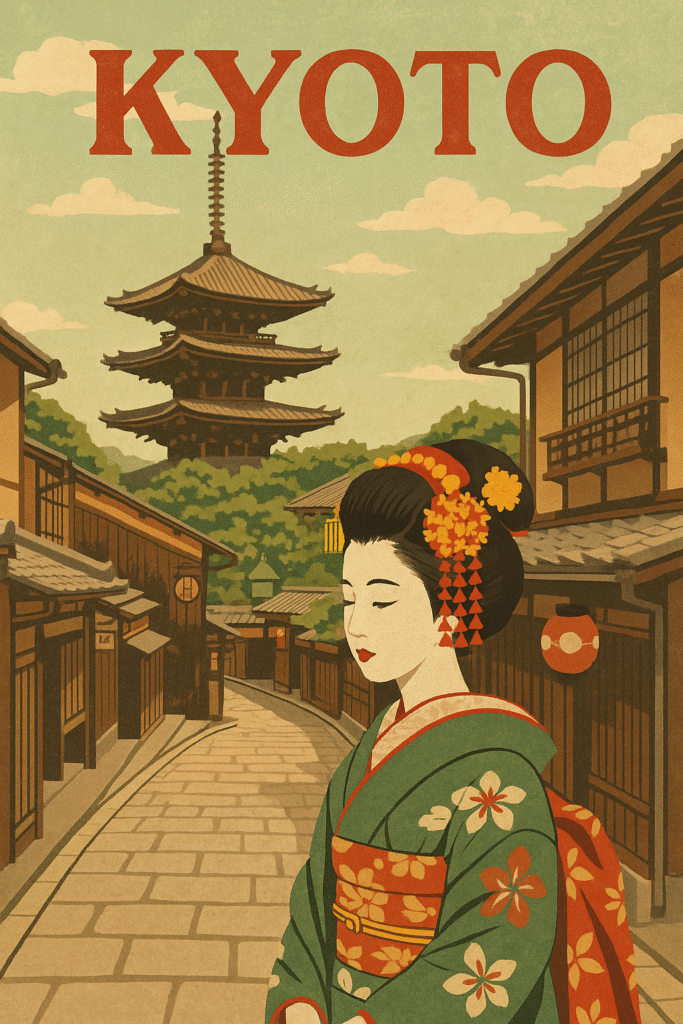 このデザインは、昭和の観光ポスターを思わせるレトロな風合いで、どこか懐かしく、あたたかい京都の魅力を一枚に閉じ込めました。